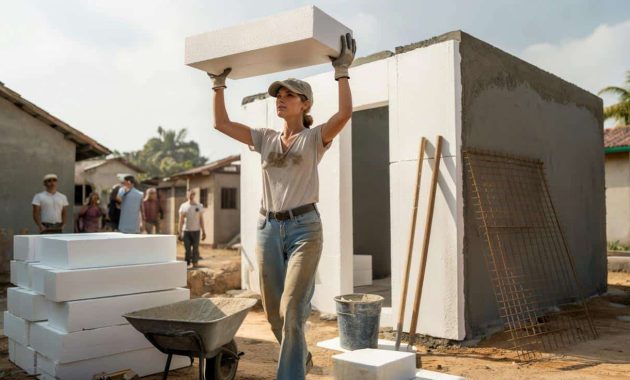 A woman builds a house alone, without bricks or concrete, using only polystyrene foam blocks, plaster, and simple structural reinforcement. Resistant to rain, intense sun, and humidity, she challenges traditional construction methods with a lightweight and inexpensive solution.