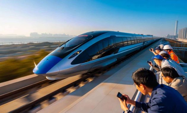 The air crackles with anticipation as a sleek, futuristic train glides silently along the test track outside Qingdao, China. This